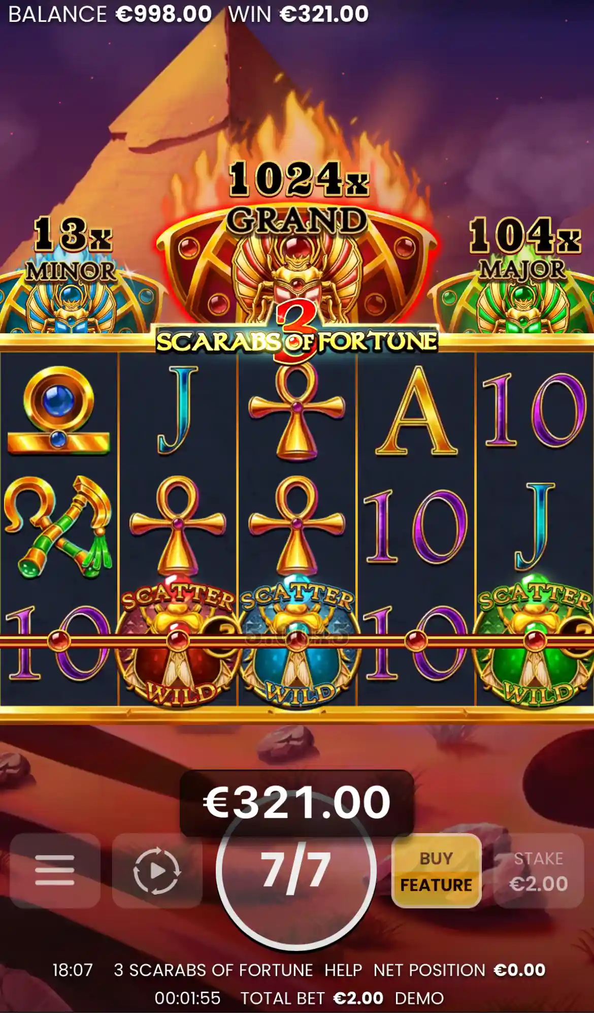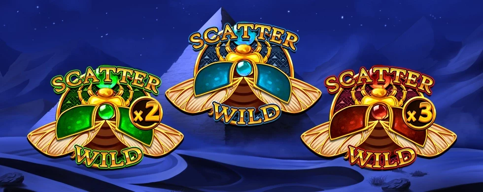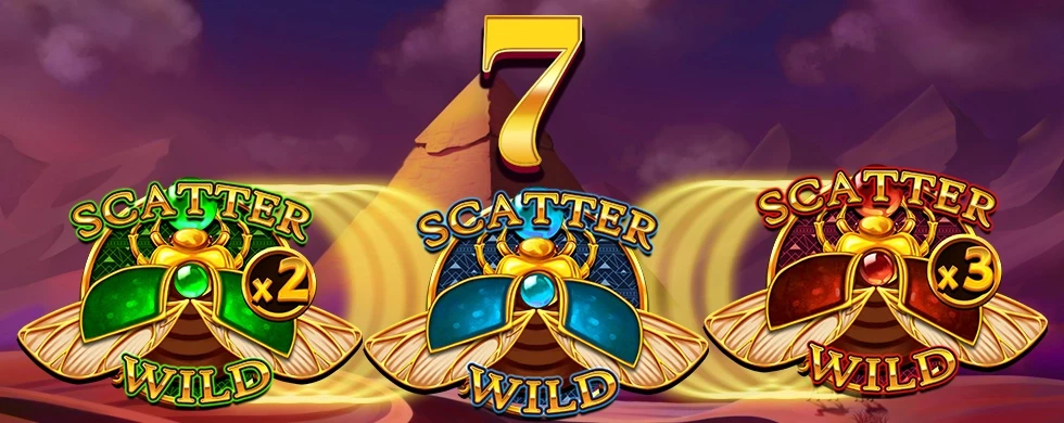 Landing all 3 Scarab Wild symbols in the same spin triggers 7 Free Spins.