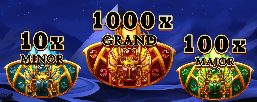 There are 3 Jackpots above the reels that correspond to the Scarab Wild symbols. Each corresponding Scarab Wild symbol that is on the reels grows its respective jackpot and has a chance to claim it. The growth of the jackpots lowers the chance they are claimed. The Jackpots are: