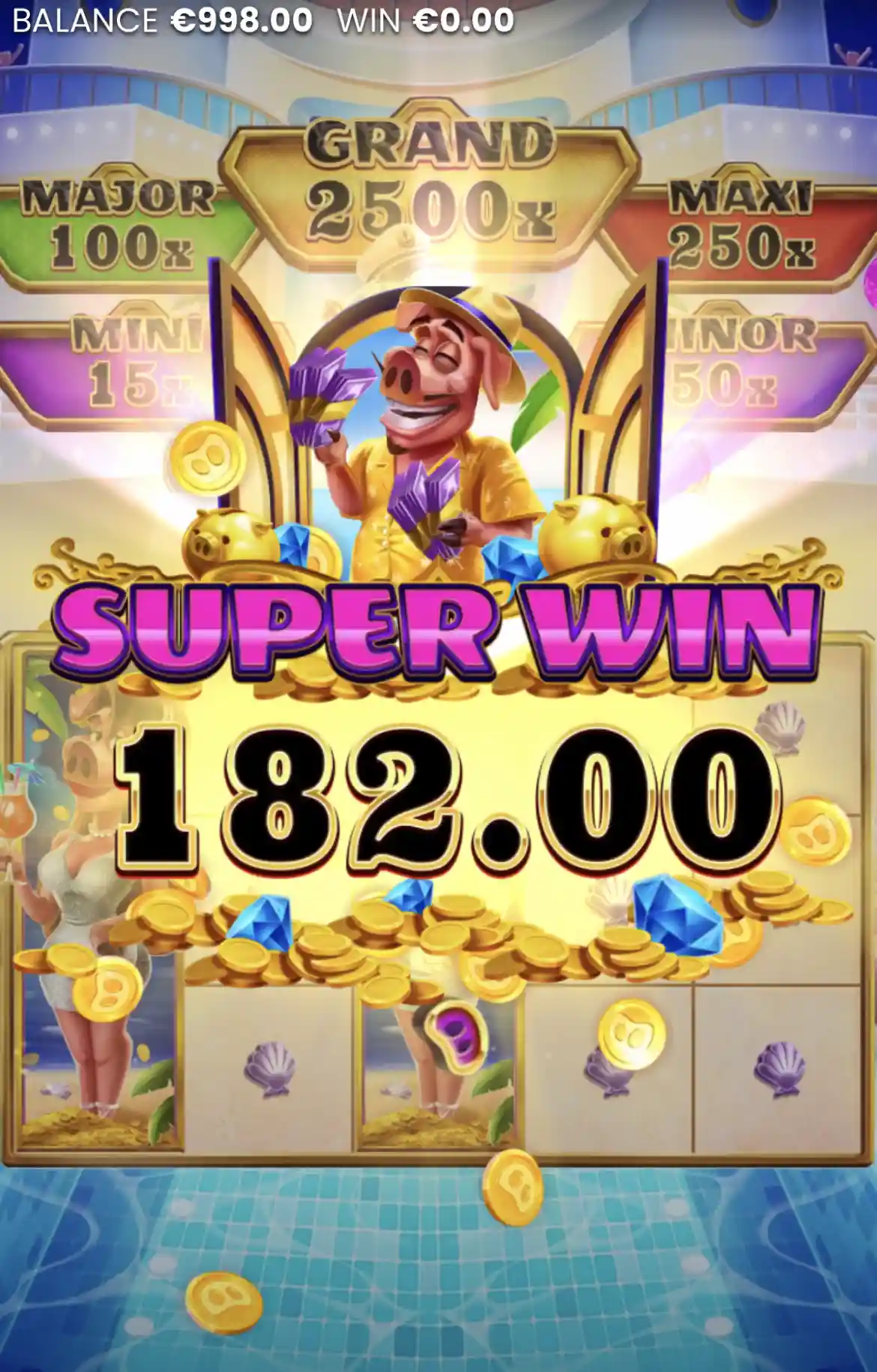 During the Smash & Win bonus, the Diamond Piggy Bank awards Cash Prizes. Each tap awards a cash prize, and the bonus continues until the piggy bank breaks without awarding a prize. Between 20 and 150 cash prizes can be awarded. If the Cash prize values are too big to display, they are instead displayed as a multiplier. The possible cash prizes are 0.1x, 0.2x, 0.3x, 0.4x, 0.5x, 0.6x, 0.7x, 0.8x, 1x, 1.2x, 1.5x, 1.7x, 2x, 2.5x, 3x, 5x, 10x the stake, Mini Jackpot, Minor Jackpot, Major Jackpot, and Maxi Jackpot.