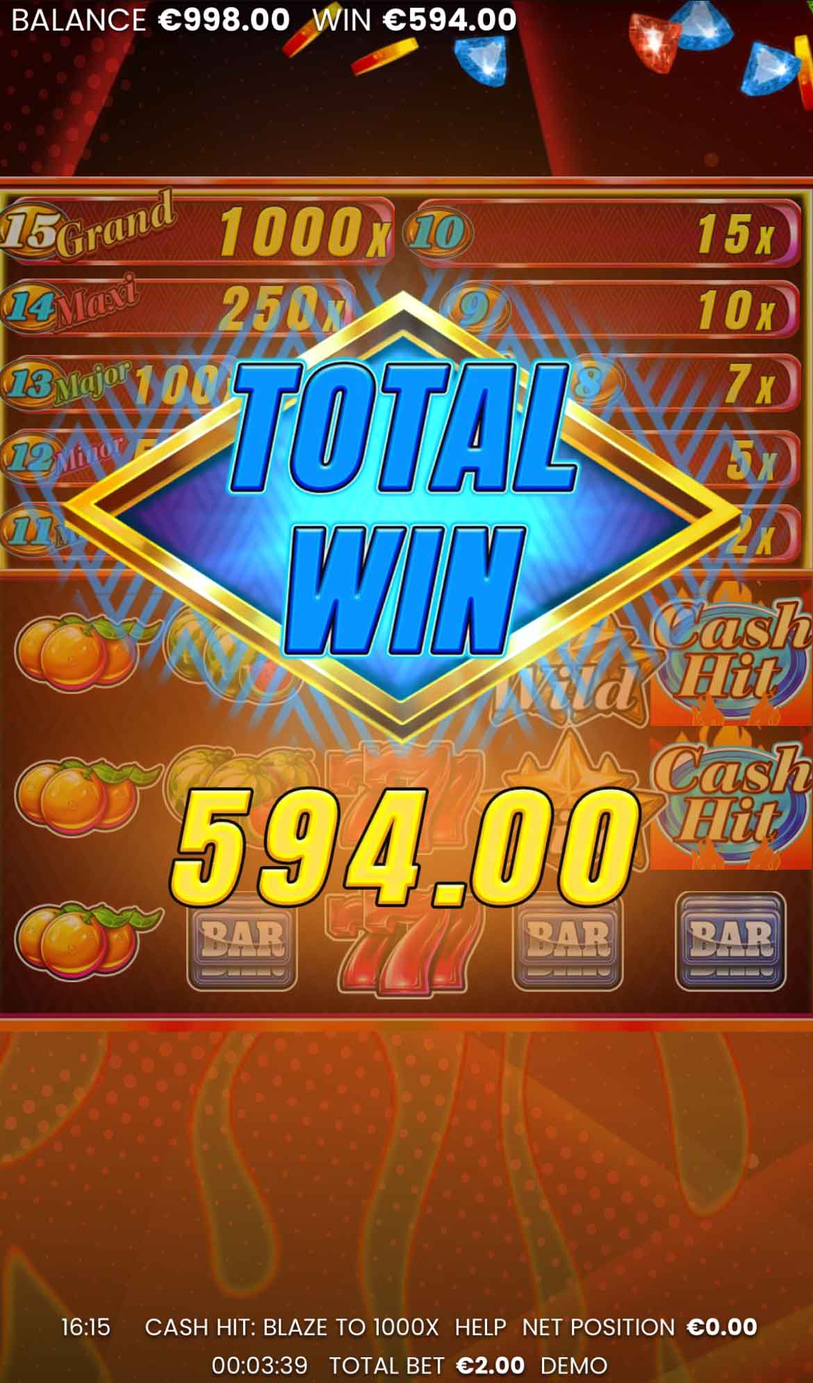 Watch the reels sizzle as you collect Cash Hit symbols to climb the prize ladder. Start with 6 for instant cash prizes and win all the way up to 15 to win the Grand Jackpot! Trigger Free Spins to get Giant 2x2 and Colossal 3x3 symbols that dominate the grid with explosive payouts. With Jackpots ready to be collected and scorching wins waiting on every spin, the heat is on. Your Blazed payouts await, so strike while the reels are hot!