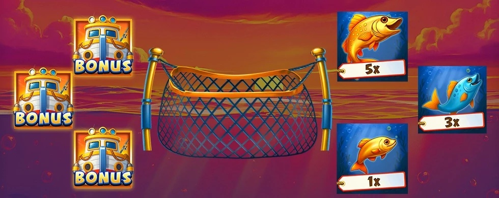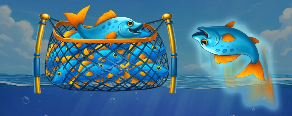 When Cash Fish symbols land on the reels, they throw a fish to the net above the reels. Each fish has a chance to trigger 10 Free Spins. The graphical accumulation of fish is purely for entertainment purposes and does not influence the chance for triggering of the feature. The Fish Net needs to be unlocked by the Spin Progress.