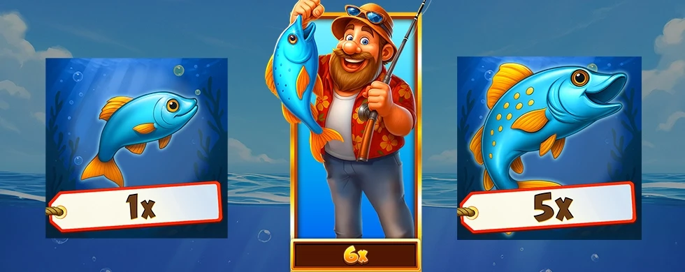 The Fisherman Wild symbol is a 1x2 Wild symbol that substitutes all other symbols, except Bonus and Jackpot symbols. The Fisherman Wild symbol collects the Cash prizes of all Fish symbols on the reels in the same spin. Up to 2 Fisherman Wild symbols can land on the reels during Free Spins at all times, and need to be unlocked from the Spin Progress to land on the reels during the Normal game.