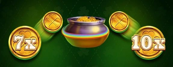 There are Golden Coin symbols that carry Cash Prizes with values of 1x, 2x, 3x, 5x, 7x, or 10x. When a Golden Coin symbol lands on the reels, it throws a coin towards the Pot below the reel it lands on. Up to 12 Cash Tiles can land on each spin. Each coin has a chance to activate the Pot and trigger the Hold & Win feature. The graphical presentation of gold and rainbow elements on the Pots is purely for visual entertainment and does not have any influence on the triggering of the feature.