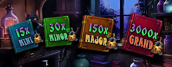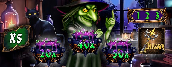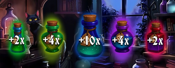 There are Cash Potions with a base starting value of 1x the stake above the reels. When a Witch symbol lands on a reel, the value of the Cash Potion above the reel grows by 1x, up to a maximum of 10x. Only 1 Witch symbol can land on the reels per spin.