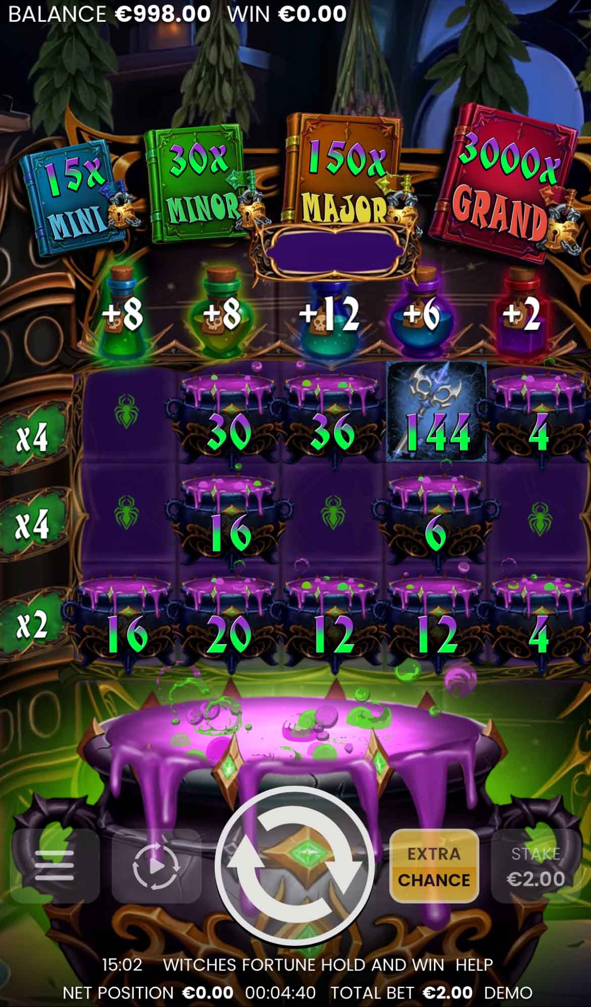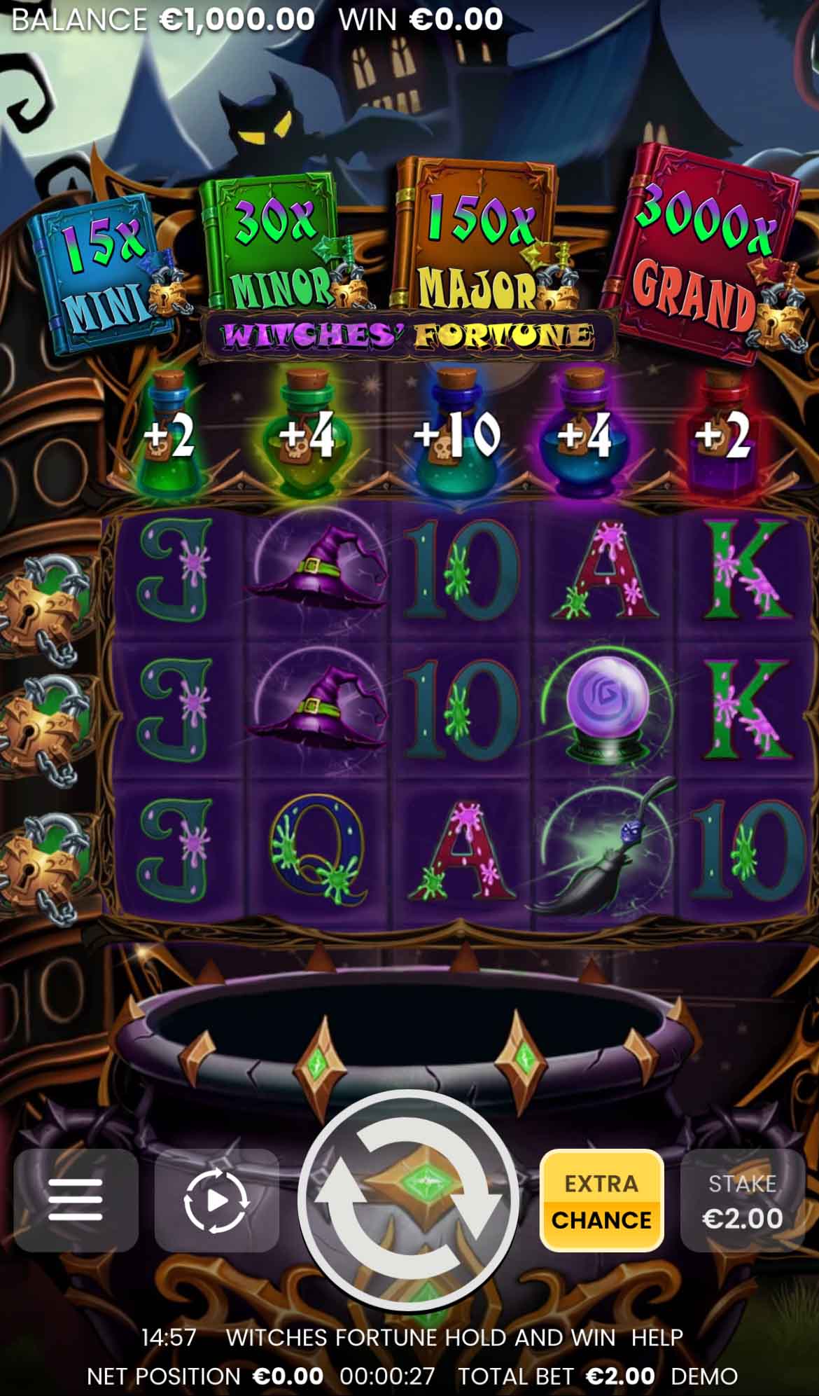 The Hold & Win bonus starts with 3 free spins, and each time a Cauldron, Witch, or Jackpot symbol lands on the reels, the spins are reset to the maximum amount. The only symbols present on the reels during the bonus are Cauldron, Witch, Jackpot, and empty symbols.